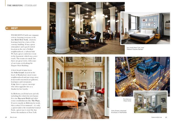 WE RECENTLY held our company retreat, housing everyone at the Ace Hotel New York, a historic boutique hotel in a turn-of-thecentury building. It has a great atmosphere and a good central location in the city’ s NoMad neighbourhood, a cultural hub. We had a great conference room in the basement, which was a nice touch. The rooms are small, but there are great views, with some of our team overlooking the Empire State Building.