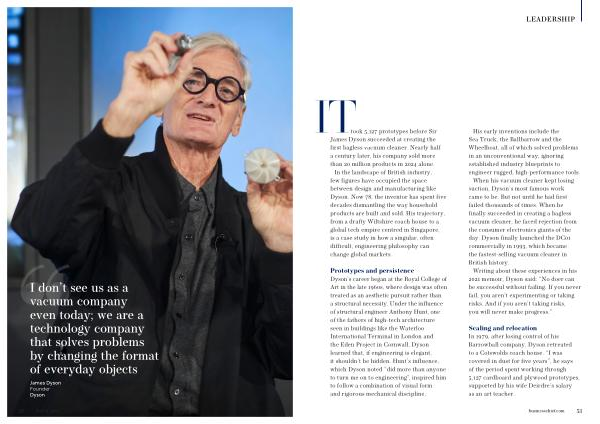 Scaling and relocation In 1979, after losing control of his Barrowball company, Dyson retreated to a Cotswolds coach house.“ I was covered in dust for five years”, he says of the period spent working through 5,127 cardboard and plywood prototypes, supported by his wife Deirdre’ s salary as an art teacher. businesschief. com