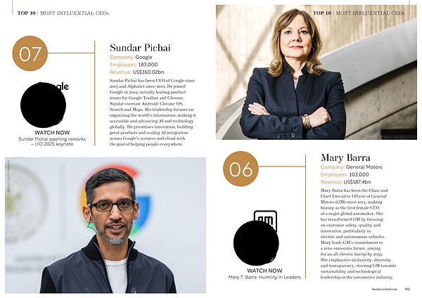 Mary Barra has been the Chair and Chief Executive Officer of General Motors( GM) since 2014, making history as the first female CEO of a major global automaker. She has transformed GM by focusing on customer safety, quality and innovation, particularly in electric and autonomous vehicles. Mary leads GM’ s commitment to a zero-emissions future, aiming for an all-electric lineup by 2035. She emphasises inclusivity, diversity and transparency, steering GM towards sustainability and technological leadership in the automotive industry. businesschief. com