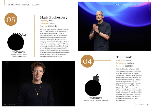 Mark Zuckerberg is the founder, chairman and CEO of Meta( formerly Facebook), which he launched in 2004 while at Harvard University. He set its strategic direction to build platforms including Facebook, Instagram, WhatsApp and emerging metaverse technologies. Mark is focused on connecting people worldwide, advancing virtual reality and developing new social experiences through Meta’ s products. His leadership drives innovation in AI, virtual worlds and social networking, aiming to build a more immersive and socially connected digital future. 70 March 2026